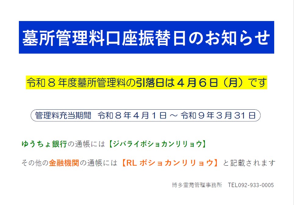 お知らせ 博多霊苑 > お知らせ > 令和8年度墓所管理料口座振替日のお知らせ 2026年02月15日 令和8年度墓所管理料口座振替日のお知らせ その他のお知らせお知らせ一覧 2026年03月09日 博多霊苑3月4月休日カレンダー 2026年3月4月の休日カレンダーです。 火曜日と水曜日が定休日ですが、4月29日が祝日の…続きを読む 2026年02月15日 令和8年度墓所管理料口座振替日のお知らせ …続きを読む 2026年01月25日 振替定休日のお知らせ …続きを読む お知らせをすべて見る カテゴリー別記事 イベント開催情報 コラム 管理事務所からのお知らせ 【重要】使用者様へのお知らせ 霊苑花だより