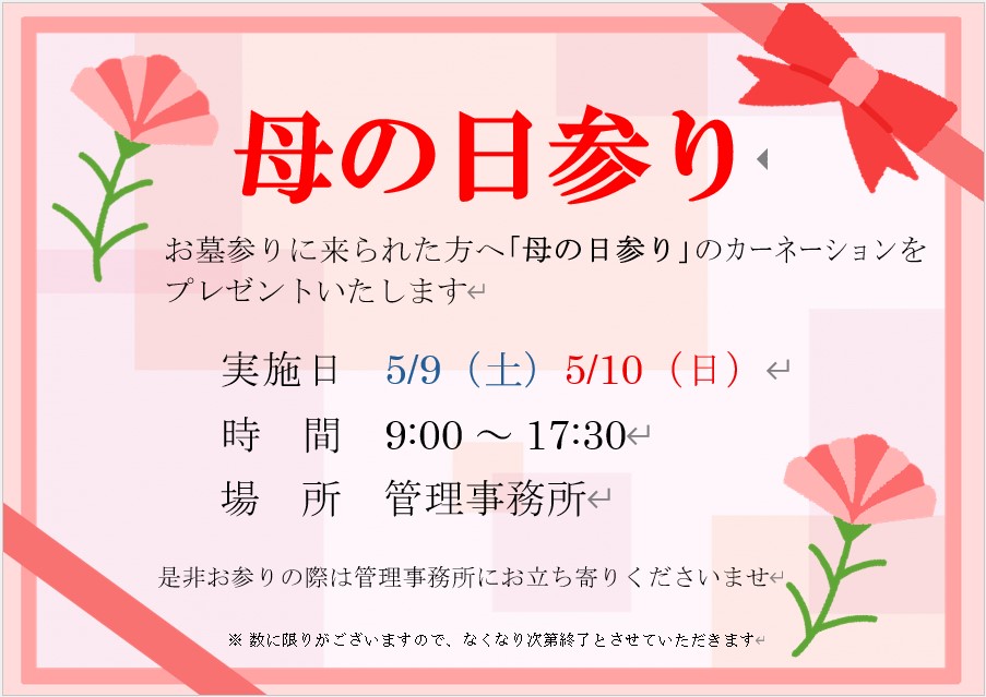 お知らせ 博多霊苑 > お知らせ > イベント開催情報 > 母の日カーネーションプレゼントのお知らせ 2026年04月17日イベント開催情報 母の日カーネーションプレゼントのお知らせ ご好評いただいている「母の日参り」のカーネーションプレゼントを今年も実施いたします。 お参りされる前に管理棟へお越しください。 その他のお知らせお知らせ一覧 2026年04月17日イベント開催情報 母の日カーネーションプレゼントのお知らせ ご好評いただいている「母の日参り」のカーネーションプレゼントを今年も実施いたします。 お参…続きを読む 2026年04月05日霊苑花だより 桜 2026/4/5 昨日雨が降り多少花びらが散ってしまいましたが、まだまだきれいな桜を楽しむことができると思います。…続きを読む 2026年04月04日管理事務所からのお知らせ 2026年4月5月振替定休日のお知らせ …続きを読む お知らせをすべて見る カテゴリー別記事 イベント開催情報 コラム 管理事務所からのお知らせ 【重要】使用者様へのお知らせ 霊苑花だより